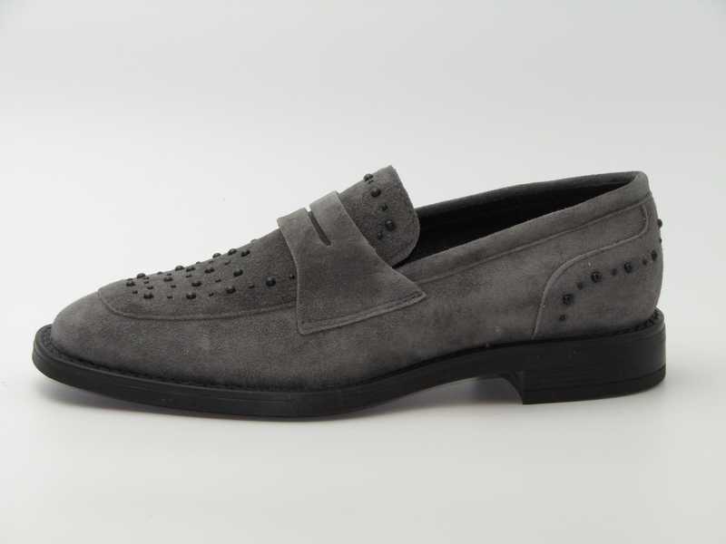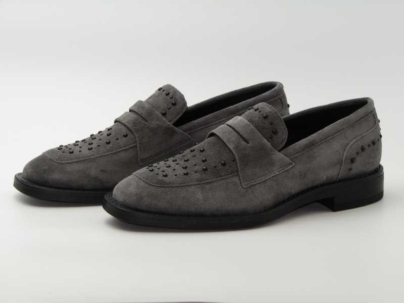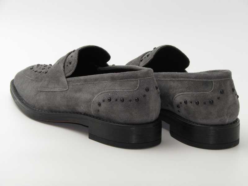 Mocasín de serraje con antifaz y tachas en pala y talón. (Modelo: 2569)