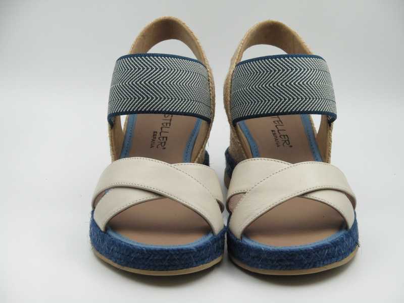 Sandalia en cuña de yute natural con triras cruzadas de piel beige y empeine elástico azul. Cuña media (Modelo: 30-125-825)