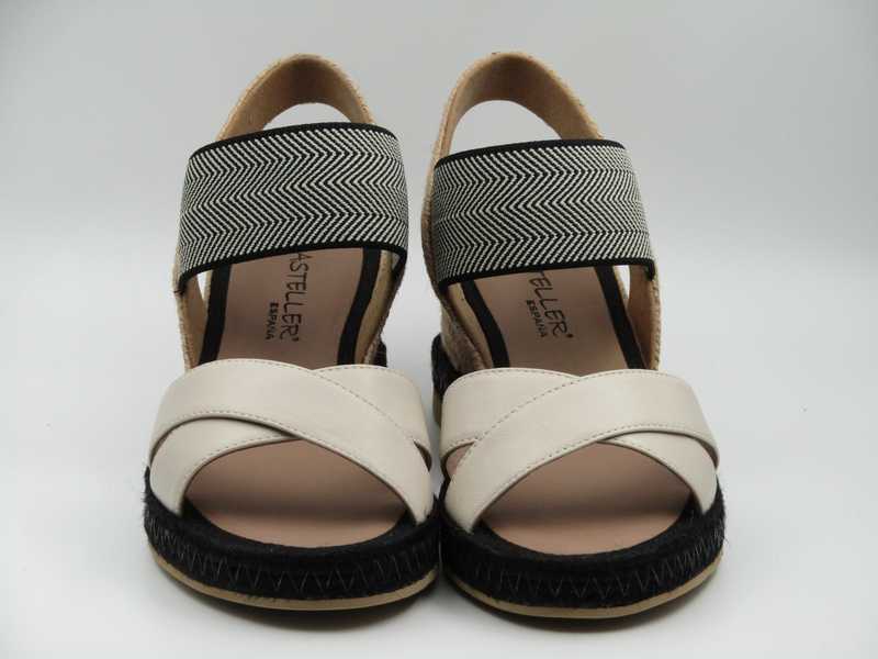 Sandalia en cuña de yute natural con tiras cruzadas de piel beige y empeine de elástico negro. Cuña media (Modelo: 30-125-825)