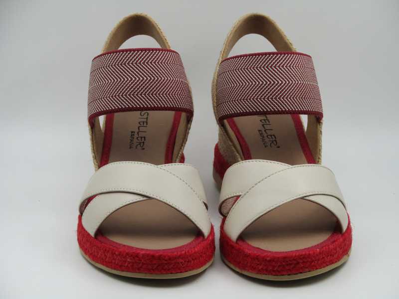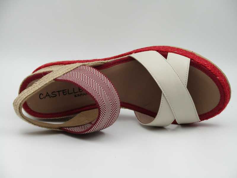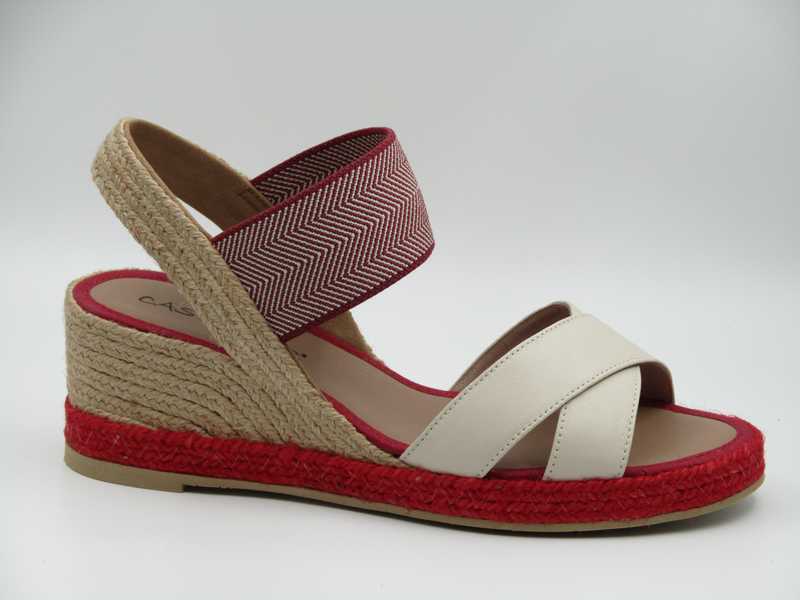 Sandalia en cuña de yute natural con tiras de piel beige y empeine elástico rojo. Cuña media (Modelo: 30-125-825)