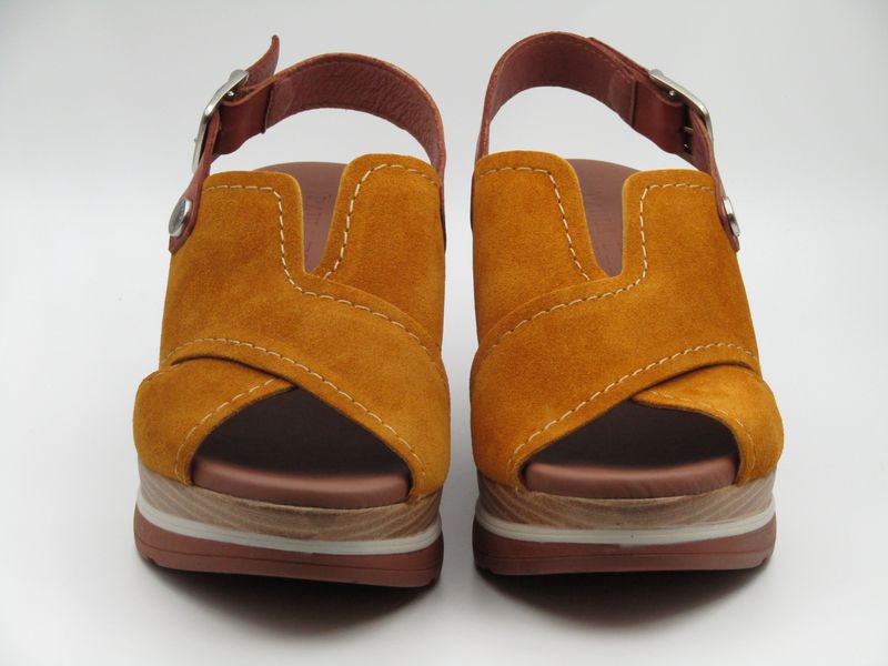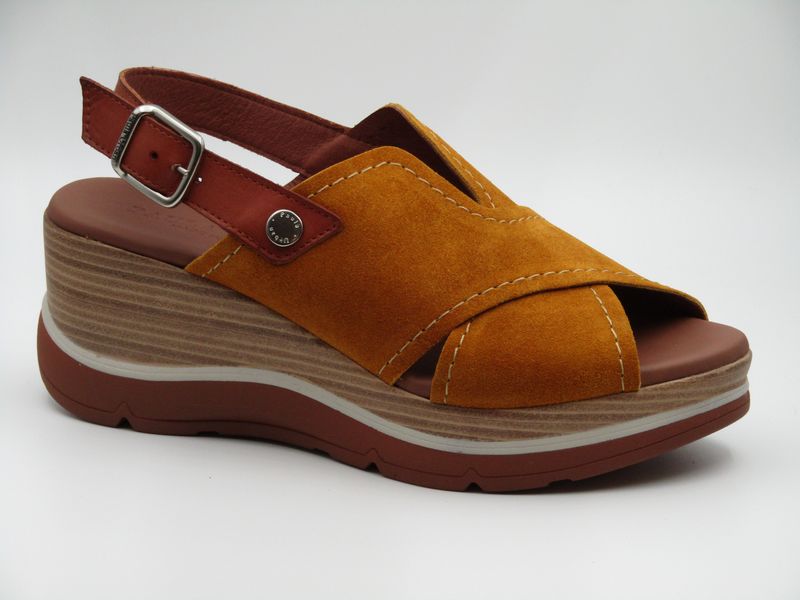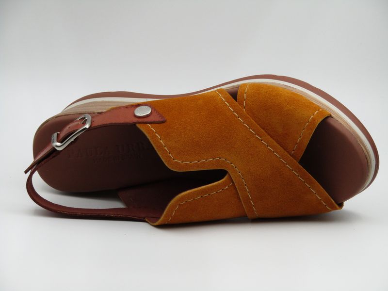 os tiras anchas cruzadas de piel serraje y talonera de piel color cuero.Planta acolchada con gel. Cuña alta (Modelo: 3-405)