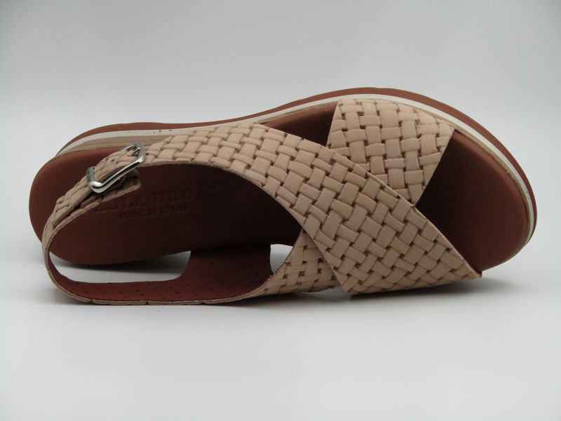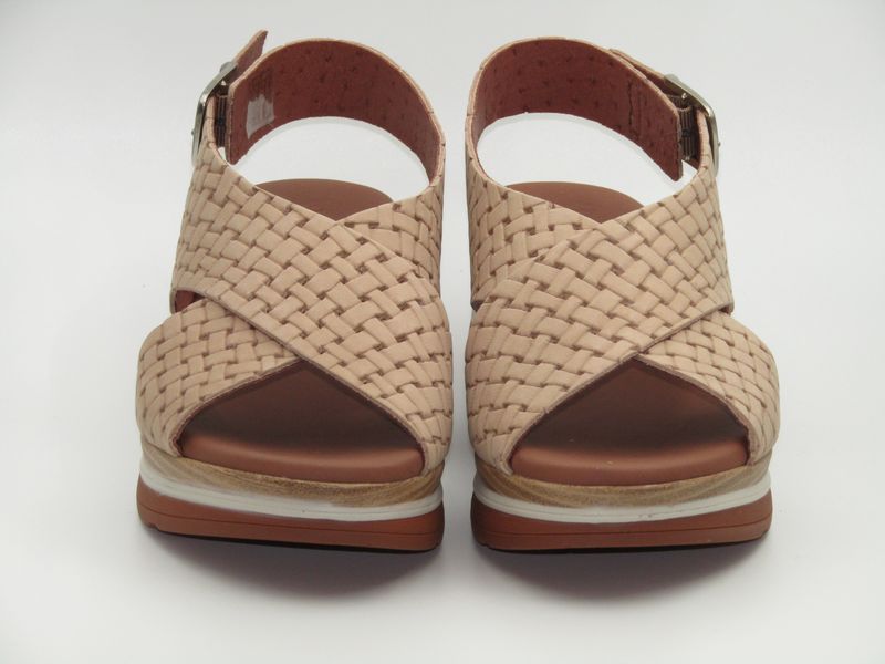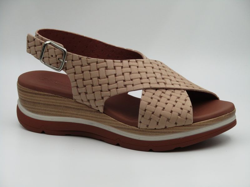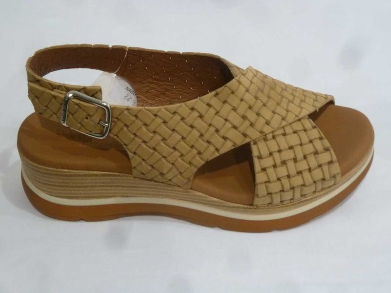 Sandalia con dos tiras trenzadas ajustable con hebilla.Planta acolchada con gel. Cuña media (Modelo: 2-457)