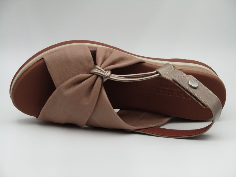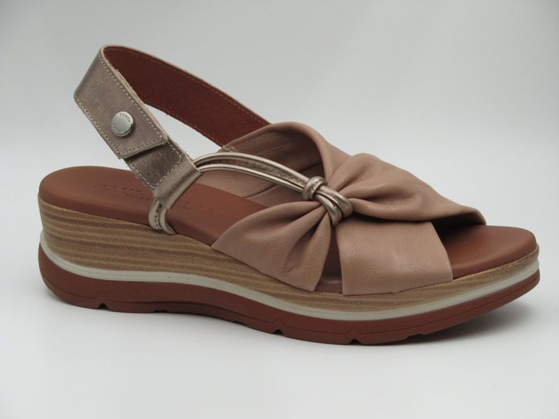 Sandalia con pala cruzada sujeta a talonera con tira metalizada.Planta acolchadfa con gel . Cuña media (Modelo: 2-416)